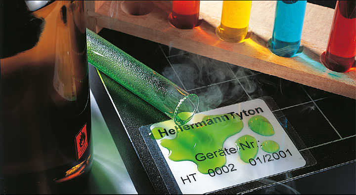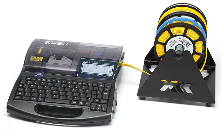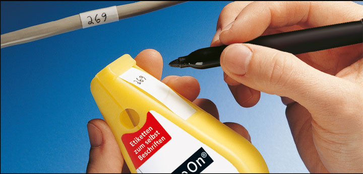 Mała przenośna drukarka podaje, drukuje i nacina profile wprowadzane z zewnątrz lub odwijane z kaset wewnętrznych.Od lat obserwuje się rosnące zainteresowanie etykietami do opisu ręcznego występującymi zarówno w postaci etykiet przeznaczonych do oznaczania powierzchni okrągłych, płaskich (tzw. etykieta pełna), jak i jako etykiety samolaminujące się (zintegrowane z laminatem ochronnym), czyli składające się z części nieprzezroczystej (pole opisowe do nanoszenia oznaczenia) i części przezroczystej (czyli laminatu). Montaż takiej etykiety polega na owinięciu przewodu lub innego okrągłego elementu tak, aby przezroczysty koniec etykiety nałożyć na nieprzezroczysty – długość etykiety musi więc być dobrana do średnicy przewodu. Etykiety samolaminujące występują również w wersji do druku – do poszczególnych rodzajów drukarek (laserowych, igłowych lub termotransferowych). Pamiętajmy, że etykiety mogą być stosowane w różnorodnych miejscach i przyklejane na różnego rodzaju powierzchnie, dlatego z uwagą wybierzmy odpowiedni zestaw materiał/klej, dzięki czemu unikniemy przykrych niespodzianek w przyszłości, typu odklejanie się oznakowań. Jako bazy klejowej często używa się akrylanów i kauczuków syntetycznych. Kleje na bazie akrylu uzyskują bardzo dobrą przyczepność po utwardzeniu się (potrzebują przynajmniej 48 godzin bez obciążenia), preparaty kauczukowe natomiast charakteryzują się dobrą przyczepnością początkową, dlatego używa się do etykiet usuwalnych. Nie zapominajmy również o tym, że powierzchnię przed naklejeniem etykiety należy oczyścić z zabrudzeń oraz odtłuścić – jest to bardzo istotna czynność, o której często zapominamy. Za przyczepność końcową etykiety odpowiadają także na pozór nic nie znaczące szczegóły, jak chociażby zaokrąglone narożniki, zapobiegające niepożądanemu oderwaniu elementu, zwłaszcza z przewodów o małej średnicy.