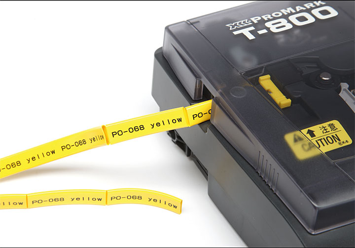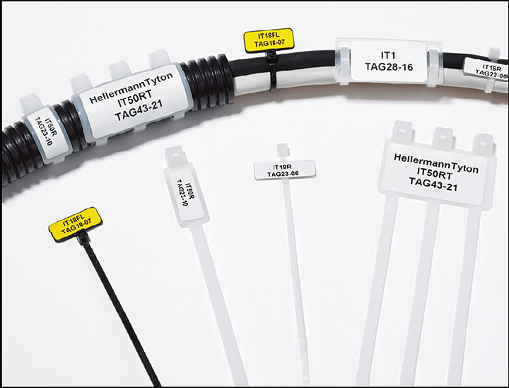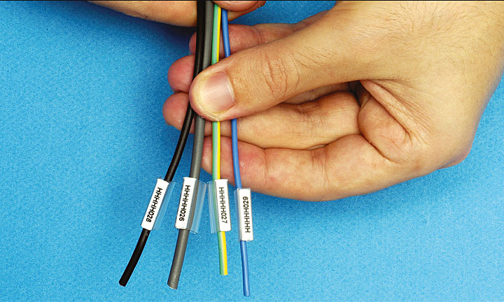 Pamiętajmy, że etykiety powinny być wykonane z materiałów, które zabezpieczą zapis przed działaniem różnego rodzaju olejów, pyłów i zanieczyszczeń.Praktyczną i szybką metodą znakowania przewodów przed ich podłączeniem jest również stosowanie oznaczników termokurczliwych, czyli elastycznych samogasnących rurek poliolefinowych. Skurcz nawet 3:1 zapewnia pokrycie przewodów o różnej średnicy. Coraz częściej koszulki termokurczliwe przeznaczone do nadruku termokurczliwego mają formę drabinki, co ułatwia pobieranie oznaczników z nośnika. Nacięcia rurek zapewniają optymalnej wielkości otwór, umożliwiający wkładanie przewodów. Rurki są specjalnie spłaszczone, a ich powierzchnia i wymiary dostosowane są do wymagań drukarek. Opisane lub zadrukowane już oznaczniki zaginamy w miejscu nacięcia. Następnie wprowadzamy przewód oraz odrywamy oznacznik od nośnej taśmy. W obiektach użyteczności publicznej, jak szkoły, lotniska czy szpitale, środkach transportu publicznego czy w przypadku tuneli warto, obok instalacji bezhalogenowej, zastosować bezhalogenowe termokurczliwe rurki (najczęściej o skurczu 2:1). Tego rodzaju materiały w przypadku pożaru nie emitują trujących gazów i związków tworzących kwasy korozyjne, nie przyczyniają się ponadto do rozprzestrzeniania się ognia.